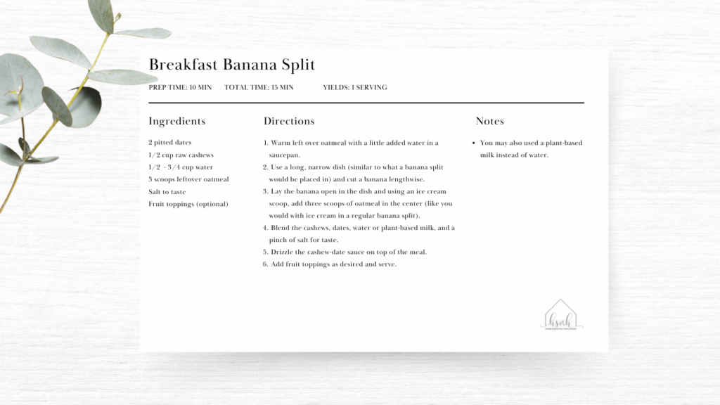 - Lay the banana open in the dish and using an ice cream scoop, add three scoops of oatmeal in the center (like you would with ice cream in a regular banana split).